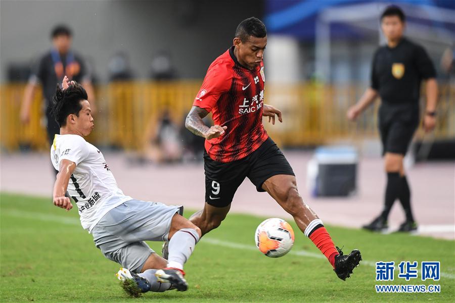 8月2日,河北华夏幸福队球员刘径(左)在比赛中防守上海上港队球员里卡多·洛佩斯。 当日,在2020赛季中国足球协会超级联赛第一阶段(苏州赛区)第二轮比赛中,河北华夏幸福队以0比4不敌上海上港队。 新华社记者 李博 摄