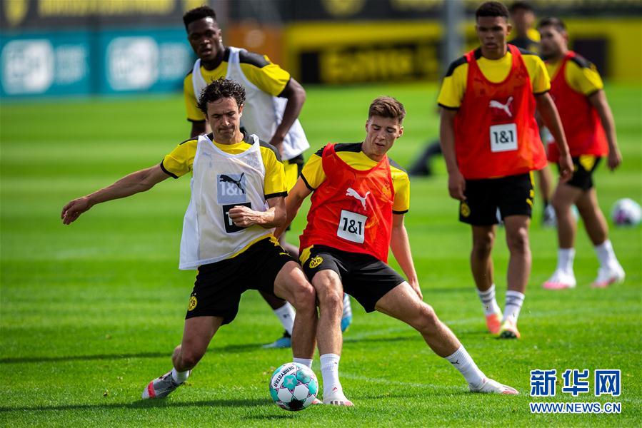 8月3日,多特蒙德队球员在训练中。 当日,德甲多特蒙德队在俱乐部基地开始新赛季备战训练。 新华社发