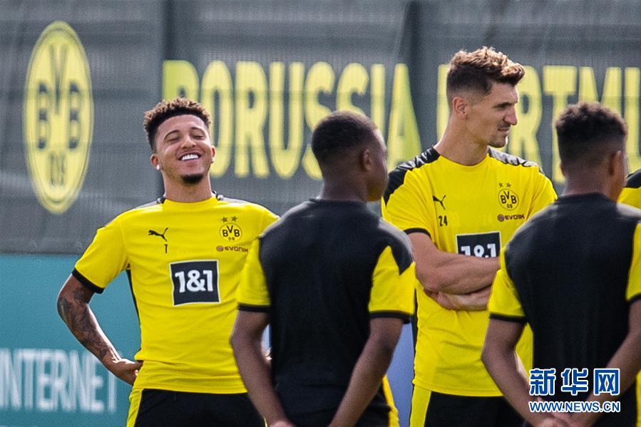 8月3日,多特蒙德队球员桑乔(左一)和穆尼耶(左三)参加训练。 当日,德甲多特蒙德队在俱乐部基地开始新赛季备战训练。 新华社发