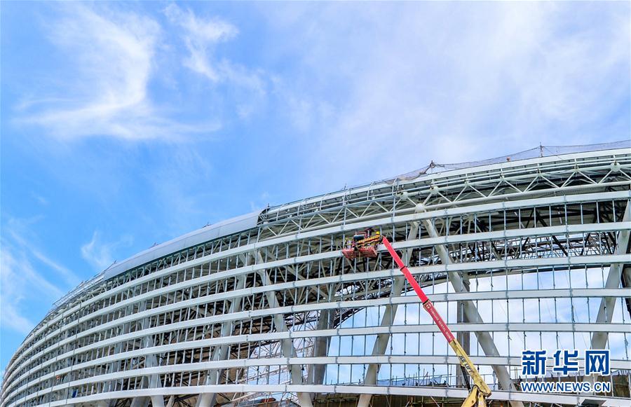 8月4日,工人在邯郸市体育中心建设现场施工。 目前,河北省邯郸市继续推进河北省第16届运动会场馆建设,生产防疫两不误。河北省邯郸市体育中心位于邯郸市东部新区,建成后将成为2022年河北省第16届运动会开闭幕式主会场。 新华社记者 王晓 摄