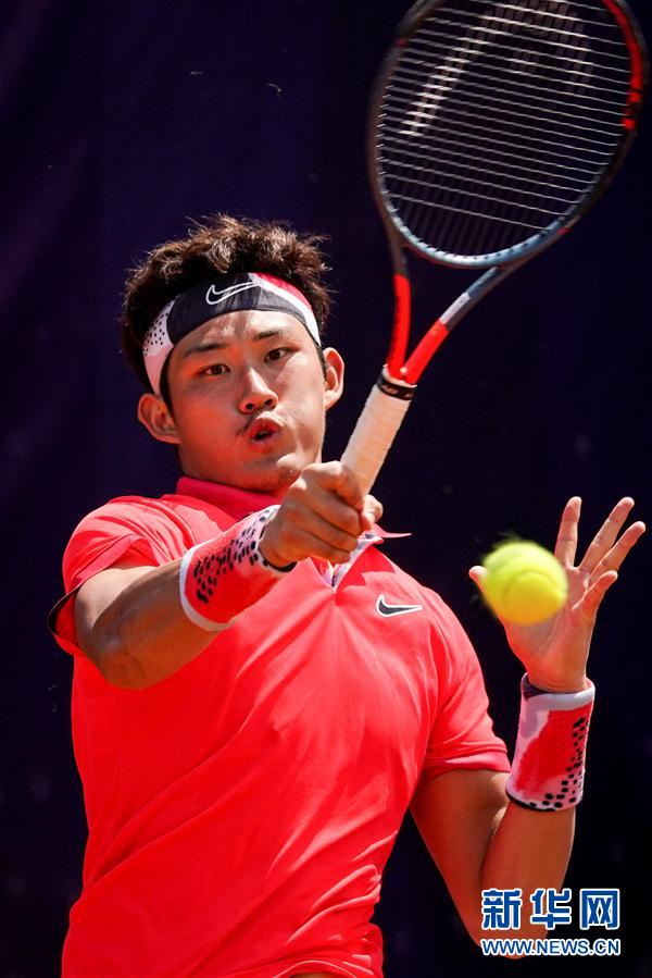 8月5日,张之臻在比赛中回球。 当日,在2020中国网球巡回赛安宁站男单正选赛第三轮比赛中,张之臻以2比1战胜李健辉。 新华社记者 胡超 摄