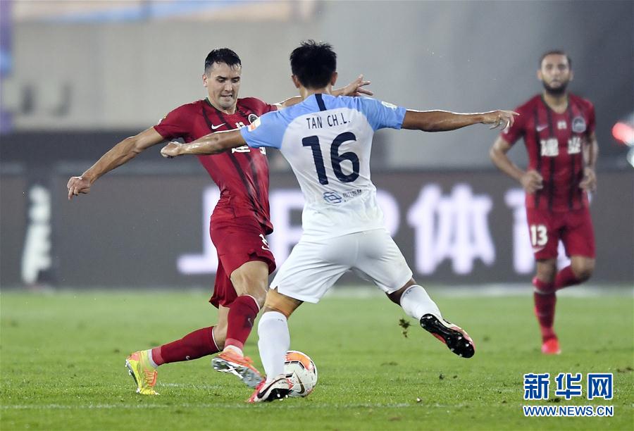 8月5日,河南建业队球员周定洋(左)在比赛中带球突破。 当日,在2020赛季中国足球协会超级联赛第一阶段(大连赛区)第三轮比赛中,广州富力队以1比1战平河南建业队。 新华社记者龙雷摄