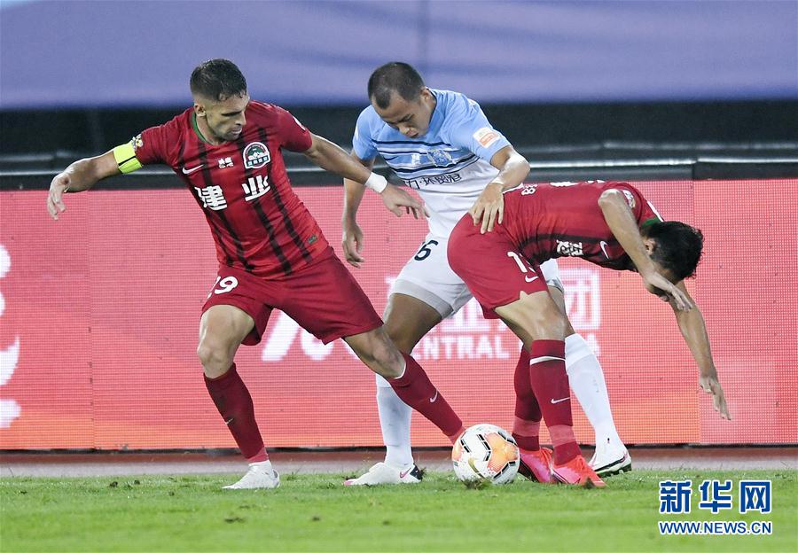 8月5日,河南建业队球员伊沃(左)在比赛中拼抢。 当日,在2020赛季中国足球协会超级联赛第一阶段(大连赛区)第三轮比赛中,广州富力队以1比1战平河南建业队。 新华社记者龙雷摄