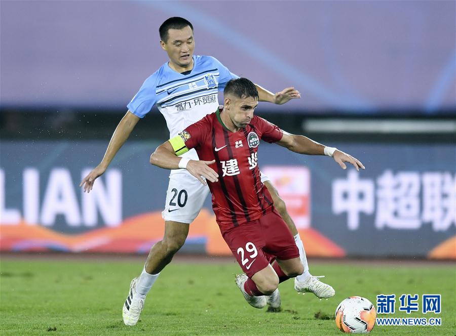 8月5日,河南建业队球员伊沃(右)在带球进攻受阻。 当日,在2020赛季中国足球协会超级联赛第一阶段(大连赛区)第三轮比赛中,广州富力队以1比1战平河南建业队。 新华社记者龙雷摄