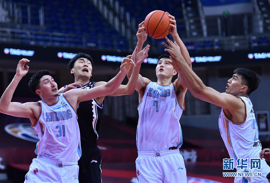 8月5日,新疆伊力特队球员俞长栋(右二)在比赛中争球。 当日,在山东青岛举行的2019-2020赛季中国男子篮球职业联赛(CBA)季后赛半决赛首轮比赛中,辽宁本钢队以116比88战胜新疆伊力特队。 新华社记者 朱峥 摄