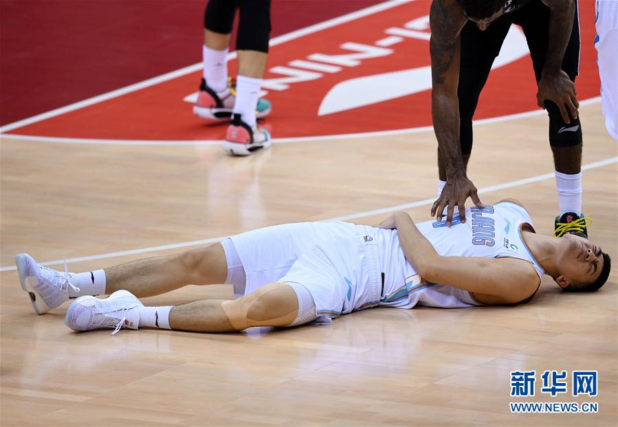 8月5日,新疆伊力特队球员唐才育受伤倒地。 当日,在山东青岛举行的2019-2020赛季中国男子篮球职业联赛(CBA)季后赛半决赛首轮比赛中,辽宁本钢队以116比88战胜新疆伊力特队。 新华社记者 李紫恒 摄