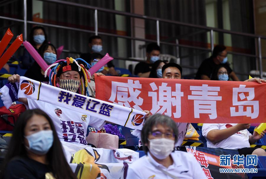 8月5日,辽宁本钢队球迷在看台上手举横幅助威。 当日,在山东青岛举行的2019-2020赛季中国男子篮球职业联赛(CBA)季后赛半决赛首轮比赛中,辽宁本钢队以116比88战胜新疆伊力特队。 新华社记者 李紫恒 摄