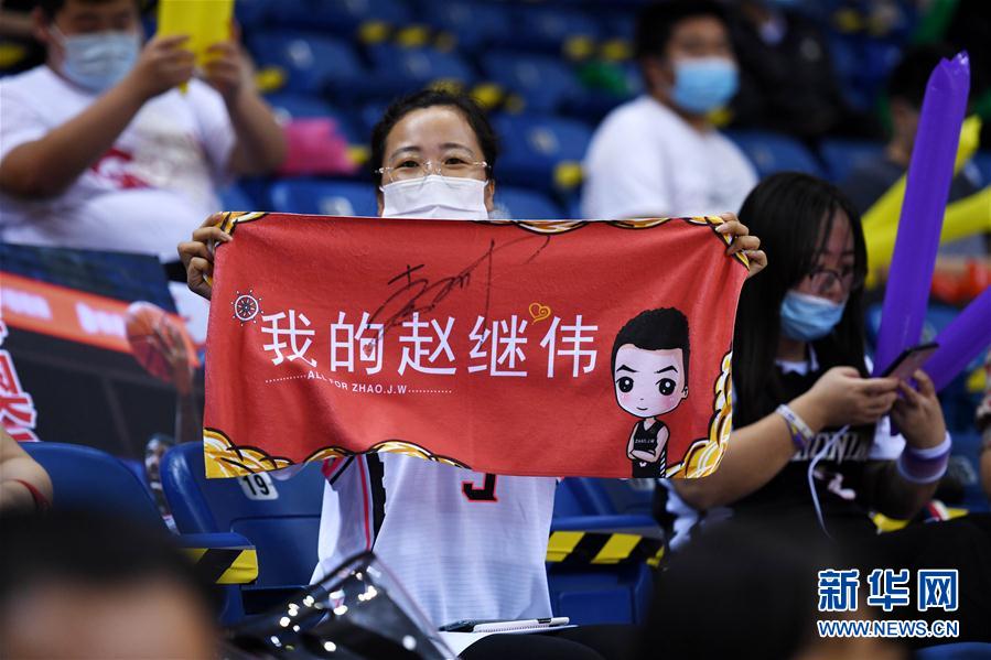 8月5日,辽宁本钢队球迷在看台助威。 当日,在山东青岛举行的2019-2020赛季中国男子篮球职业联赛(CBA)季后赛半决赛首轮比赛中,辽宁本钢队以116比88战胜新疆伊力特队。 新华社记者 李紫恒 摄