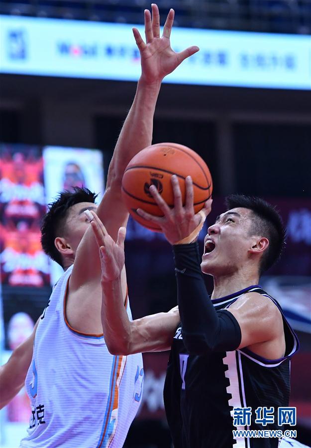 8月5日,辽宁本钢队球员高诗岩(右)在比赛突破。 当日,在山东青岛举行的2019-2020赛季中国男子篮球职业联赛(CBA)季后赛半决赛首轮比赛中,辽宁本钢队以116比88战胜新疆伊力特队。 新华社记者 朱峥 摄
