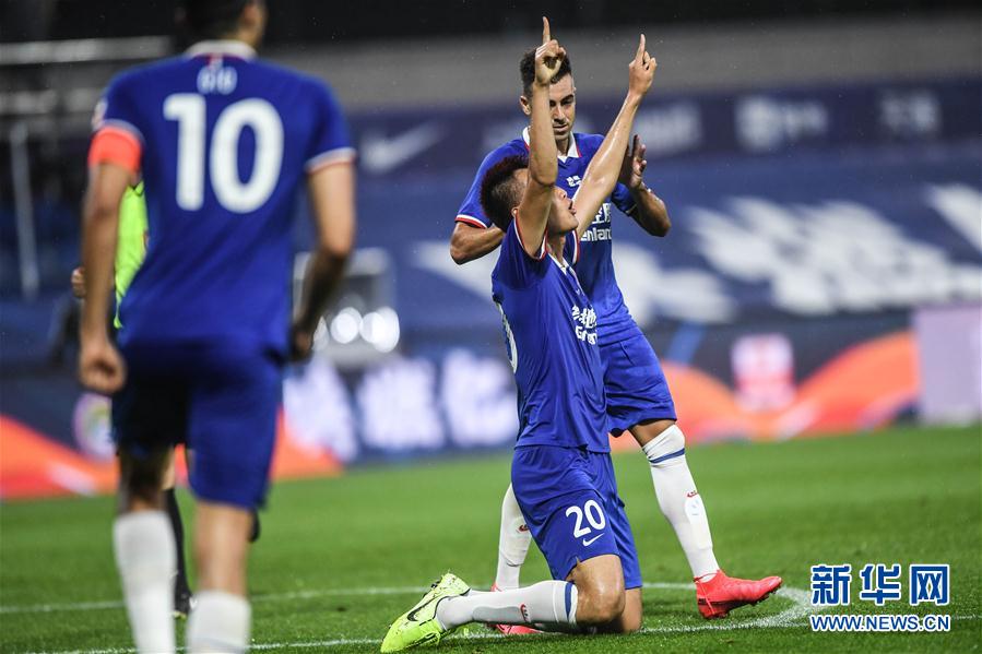 8月5日,上海绿地申花队球员金信煜(右前)进球后庆祝。 当日,在2020中国足球协会超级联赛(大连赛区)第三轮比赛中,上海绿地申花队以1比0战胜山东鲁能泰山队。 新华社记者 潘昱龙 摄