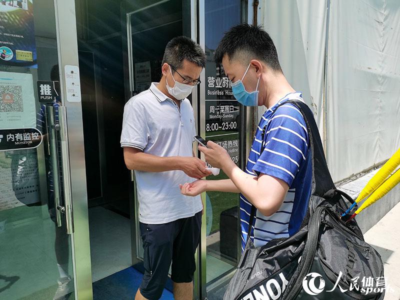 球馆工作人员为羽毛球爱好者测体温(人民网 赵欣悦摄)