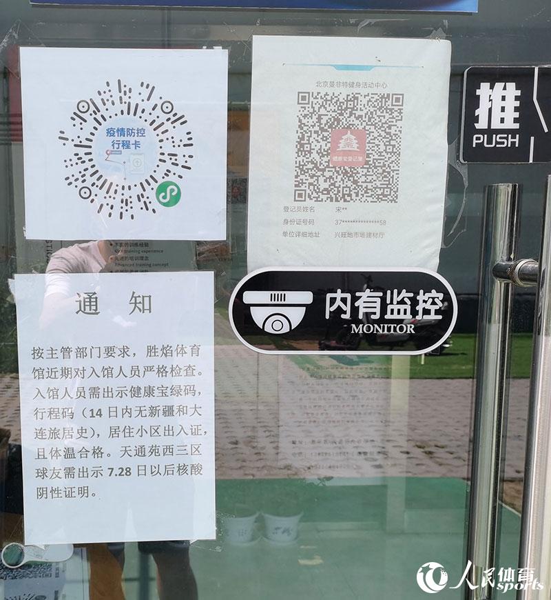 球馆门口的防疫提示和健康宝二维码(人民网 赵欣悦摄)