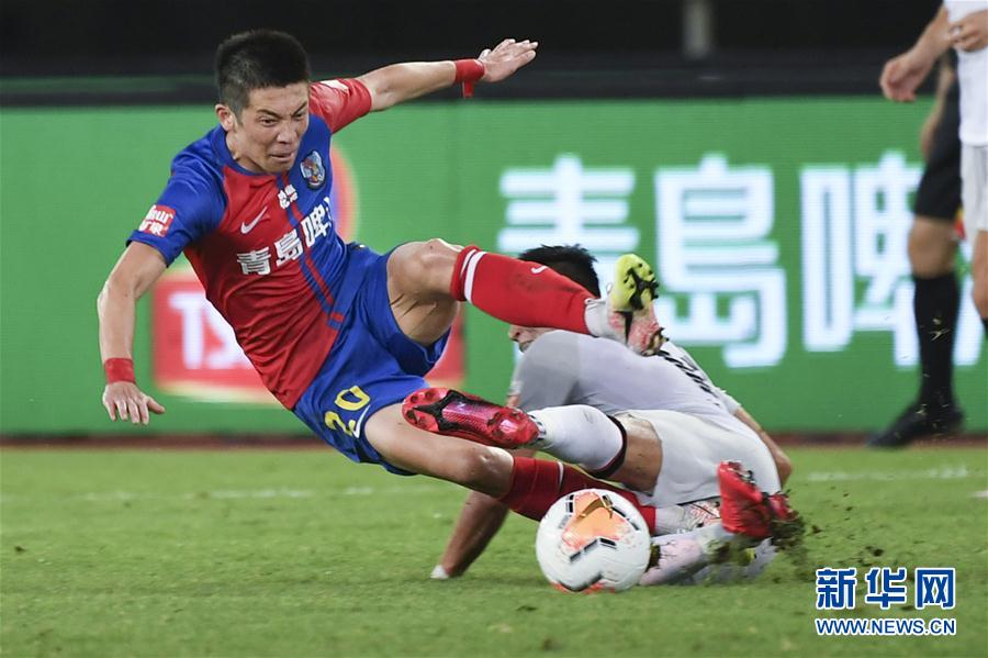 8月6日,青岛黄海青港队球员王飞(左)在比赛中争抢。 当日,在2020赛季中国足球协会超级联赛第一阶段(苏州赛区)第三轮比赛中,青岛黄海青港队以1比1战平上海上港队。 新华社记者 韩瑜庆 摄