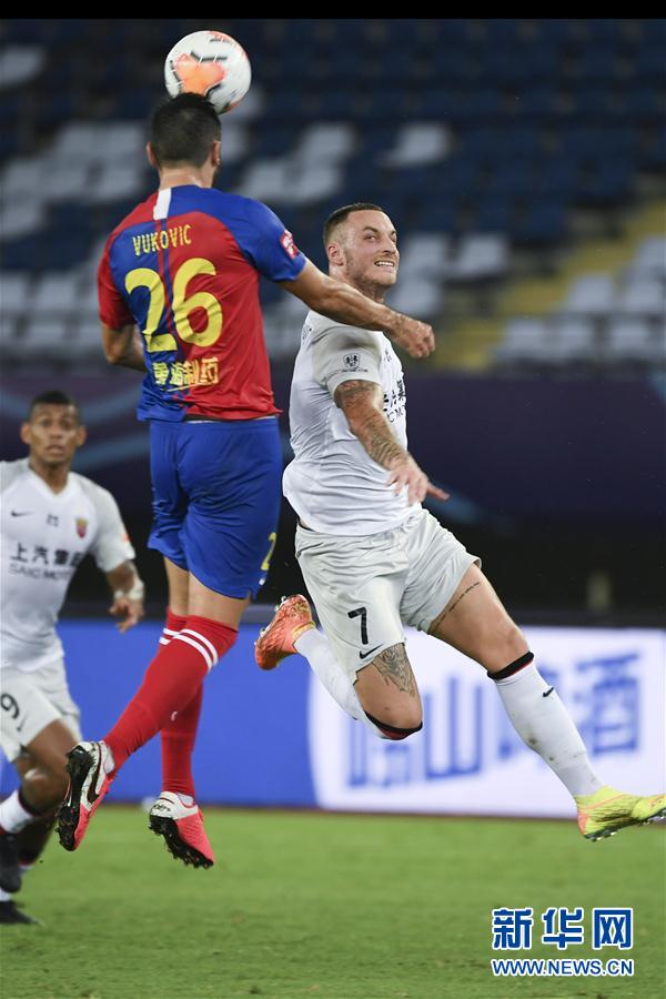 8月6日,上海上港队球员阿瑙托维奇(右)在比赛中争抢头球。 当日,在2020赛季中国足球协会超级联赛第一阶段(苏州赛区)第三轮比赛中,青岛黄海青港队以1比1战平上海上港队。 新华社记者 韩瑜庆 摄