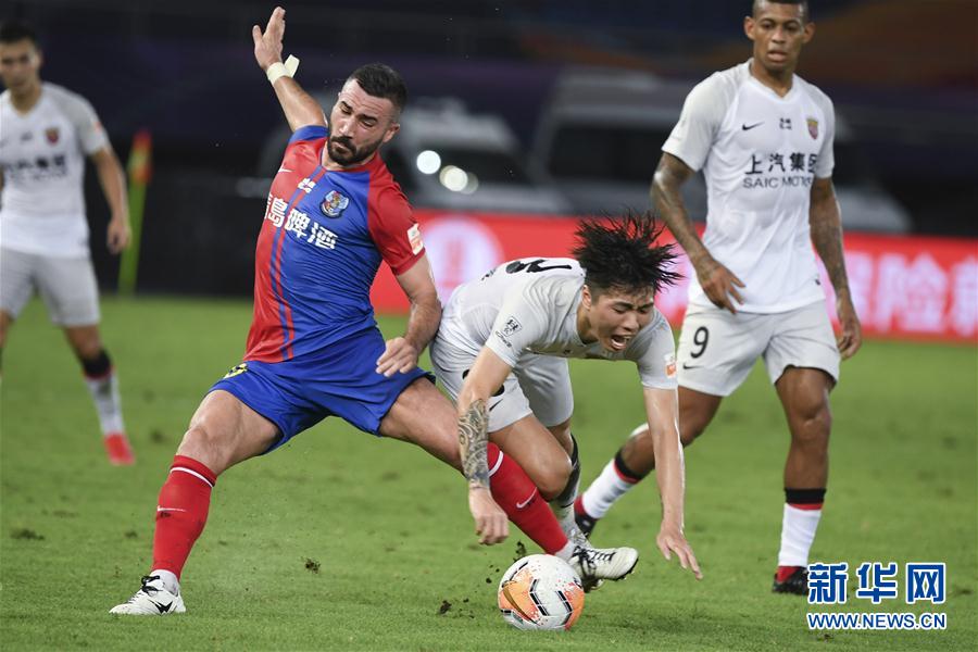 8月6日,青岛黄海青港队球员亚历山德里尼(左)在比赛中争抢。 当日,在2020赛季中国足球协会超级联赛第一阶段(苏州赛区)第三轮比赛中,青岛黄海青港队以1比1战平上海上港队。 新华社记者 韩瑜庆 摄