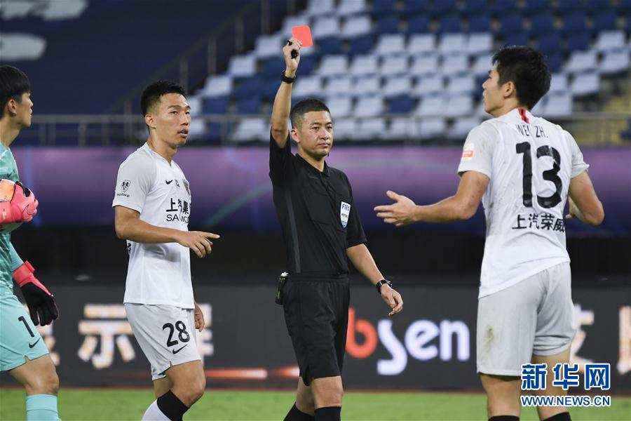8月6日,主裁判张雷向上海上港队球员魏震(右)出示红牌。 当日,在2020赛季中国足球协会超级联赛第一阶段(苏州赛区)第三轮比赛中,青岛黄海青港队以1比1战平上海上港队。 新华社记者 韩瑜庆 摄