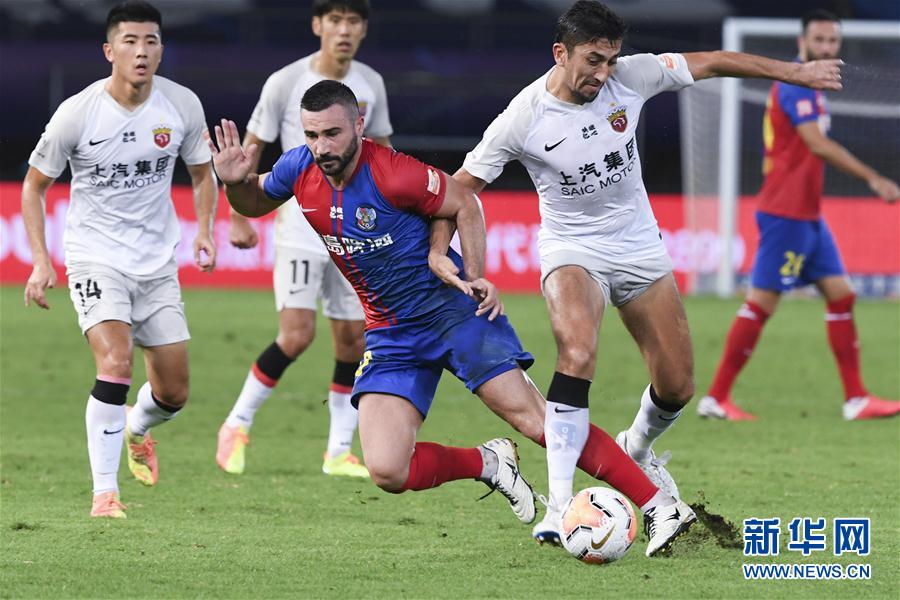 8月6日,上海上港队球员艾哈迈多夫(前右)与青岛黄海青港队球员亚历山德里尼(左二)在比赛中争抢。 当日,在2020赛季中国足球协会超级联赛第一阶段(苏州赛区)第三轮比赛中,青岛黄海青港队以1比1战平上海上港队。 新华社记者 韩瑜庆 摄