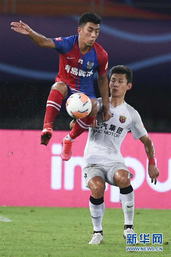 8月6日,青岛黄海青港队球员麦麦提阿卜杜拉·艾孜麦提(左)在比赛中跃起争抢。 当日,在2020赛季中国足球协会超级联赛第一阶段(苏州赛区)第三轮比赛中,青岛黄海青港队以1比1战平上海上港队。 新华社记者 韩瑜庆 摄