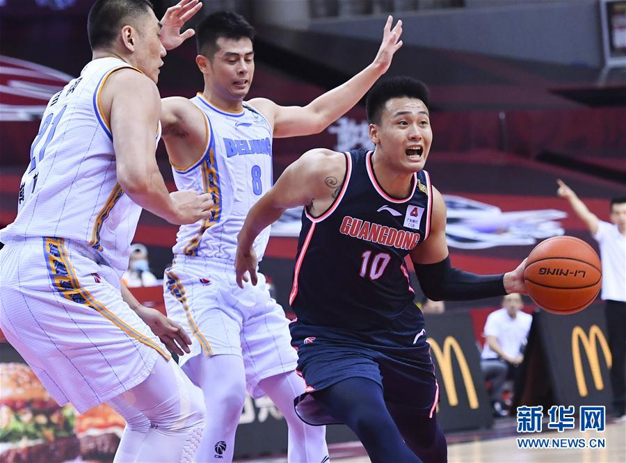 8月6日,广东东莞银行队球员赵睿(右)在比赛中突破。 当日,在山东青岛举行的2019-2020赛季中国男子篮球职业联赛(CBA)季后赛半决赛第二轮比赛中,广东东莞银行队以86比90不敌北京首钢队,总比分战成1比1平。 新华社记者朱峥摄