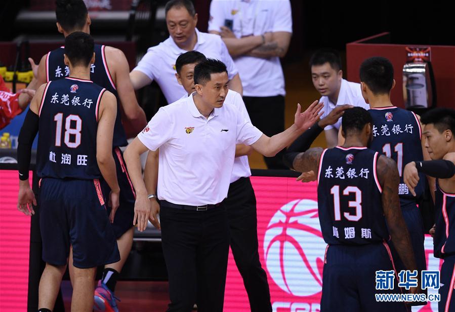 8月6日,广东东莞银行队主教练杜锋(中)在比赛中鼓励球员。 当日,在山东青岛举行的2019-2020赛季中国男子篮球职业联赛(CBA)季后赛半决赛第二轮比赛中,广东东莞银行队以86比90不敌北京首钢队,总比分战成1比1平。 新华社记者李紫恒摄