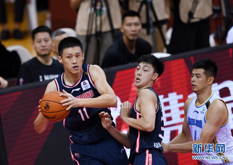 8月6日,广东东莞银行队球员周鹏(左一)在比赛中伺机传球。 当日,在山东青岛举行的2019-2020赛季中国男子篮球职业联赛(CBA)季后赛半决赛第二轮比赛中,广东东莞银行队以86比90不敌北京首钢队,总比分战成1比1平。 新华社记者李紫恒摄