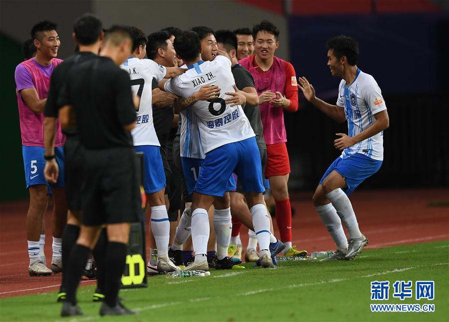 8月6日,天津泰达队球员在比赛中庆祝进球。 当日,在2020赛季中国足球协会超级联赛第一阶段(苏州赛区)第三轮比赛中,北京中赫国安队以3比1战胜天津泰达队。 新华社记者 季春鹏 摄
