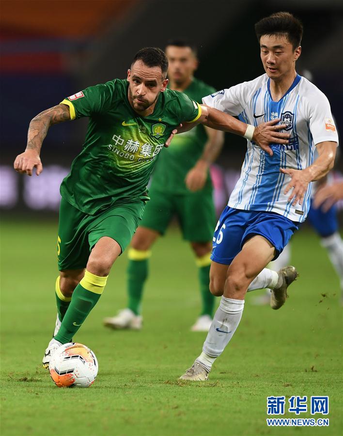 8月6日,北京中赫国安队球员奥古斯托(左)在比赛中突破。 当日,在2020赛季中国足球协会超级联赛第一阶段(苏州赛区)第三轮比赛中,北京中赫国安队以3比1战胜天津泰达队。 新华社记者 季春鹏 摄