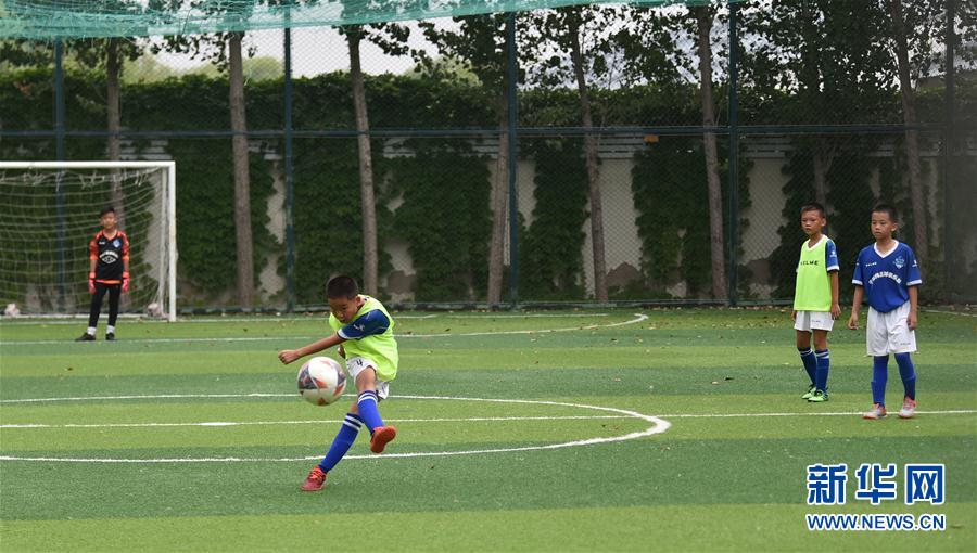 8月6日,U10精英队球员踢罚任意球。 当日,在天津市河东区富民体育公园足球场,来自于根伟青少年足球俱乐部U10精英队的10余名小球员参加暑期足球训练,在绿茵场上快乐驰骋,享受足球运动带来的乐趣。 新华社发 (孙凡越 摄)