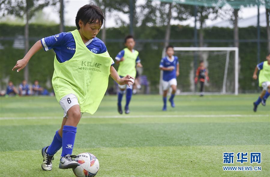 8月6日,U10精英队球员崔起畅在分组对抗中带球突破。 当日,在天津市河东区富民体育公园足球场,来自于根伟青少年足球俱乐部U10精英队的10余名小球员参加暑期足球训练,在绿茵场上快乐驰骋,享受足球运动带来的乐趣。 新华社发 (孙凡越 摄)