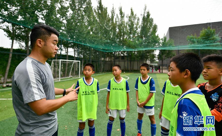 8月6日,U10精英队主教练王瑞龙(左一)在训练中指导小球员。 当日,在天津市河东区富民体育公园足球场,来自于根伟青少年足球俱乐部U10精英队的10余名小球员参加暑期足球训练,在绿茵场上快乐驰骋,享受足球运动带来的乐趣。 新华社发 (孙凡越 摄)