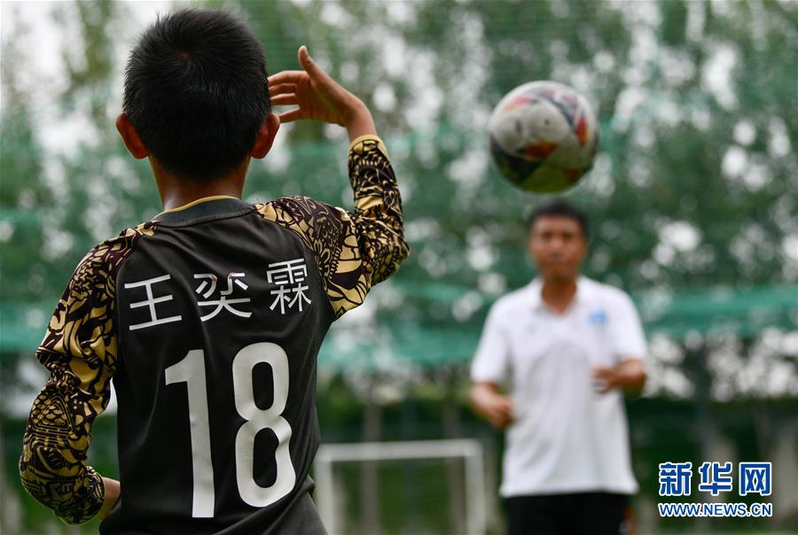 8月6日,U10精英队门将王奕霖(左)在训练中。 当日,在天津市河东区富民体育公园足球场,来自于根伟青少年足球俱乐部U10精英队的10余名小球员参加暑期足球训练,在绿茵场上快乐驰骋,享受足球运动带来的乐趣。 新华社发 (孙凡越 摄)