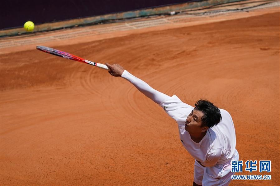 8月6日,王楚涵在比赛中发球。 当日,在2020中国网球巡回赛安宁站男单四分之一决赛中,王楚涵以2比1战胜张择,晋级四强。 新华社记者 胡超 摄