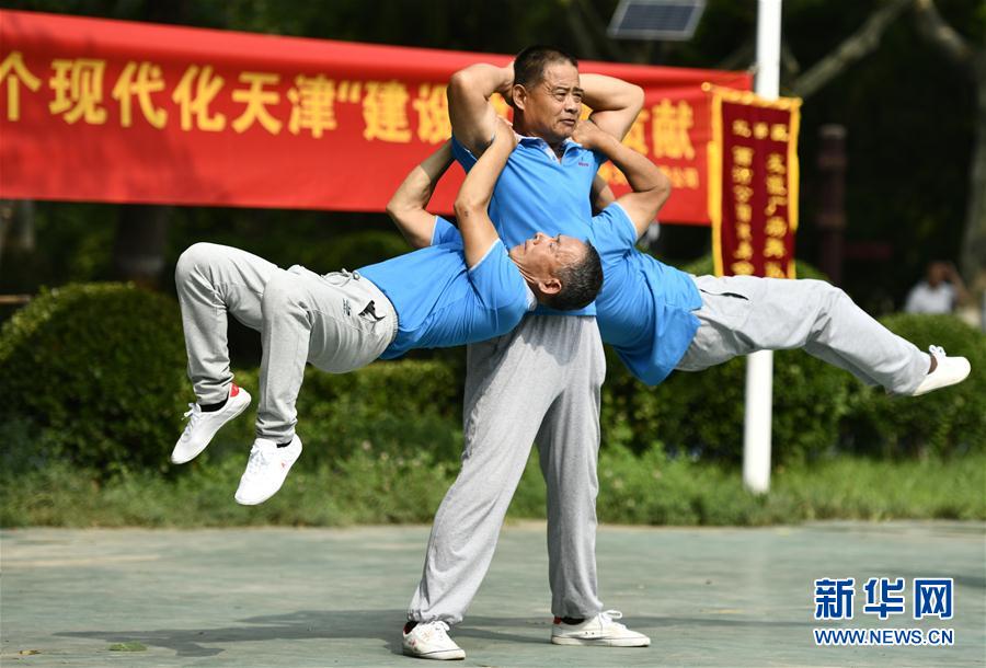 上杠、翻转、倒立.......在天津市红桥区西沽公园内的健身园,一群平均年龄68岁的老人正在练习各种体操和杂技动作,引得围观群众发出连连赞叹。 这支远近闻名的“老顽童”体操队现有固定成员20多人,年龄最大的81岁,最小的53岁。体操队成立10年来,他们坚持每天锻炼、每周表演。 队长佟玉根说:“我们不服老也不怕老,小时候都是‘孩子王’,老了也要强。健身锻炼让我们各个又强又壮,身体健康才能生活有质量。” 近年来,随着“老顽童”体操队的知名度不断提升,队伍也逐渐壮大。除了固定成员外,还有百余位健身爱好者经常一起参加锻炼。“老顽童”体操队的目标就是带动更多人参与到全民健身中来。 在天津市红桥区西沽公园,“老顽童”体操队队员展示技巧动作(8月1日摄)。 新华社记者 李然 摄