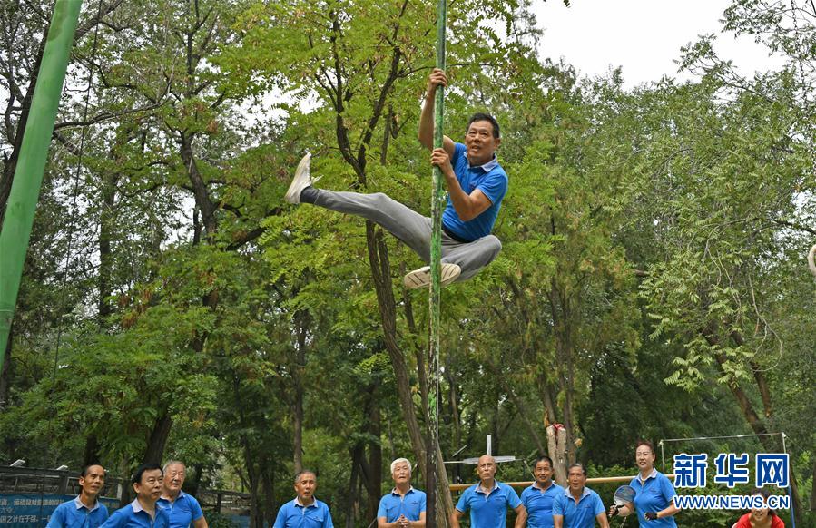 上杠、翻转、倒立.......在天津市红桥区西沽公园内的健身园,一群平均年龄68岁的老人正在练习各种体操和杂技动作,引得围观群众发出连连赞叹。 这支远近闻名的“老顽童”体操队现有固定成员20多人,年龄最大的81岁,最小的53岁。体操队成立10年来,他们坚持每天锻炼、每周表演。 队长佟玉根说:“我们不服老也不怕老,小时候都是‘孩子王’,老了也要强。健身锻炼让我们各个又强又壮,身体健康才能生活有质量。” 近年来,随着“老顽童”体操队的知名度不断提升,队伍也逐渐壮大。除了固定成员外,还有百余位健身爱好者经常一起参加锻炼。“老顽童”体操队的目标就是带动更多人参与到全民健身中来。 在天津市红桥区西沽公园,“老顽童”体操队队员、62岁的刘元柱(上)练习爬杆动作(8月4日摄)。 新华社记者 李然 摄