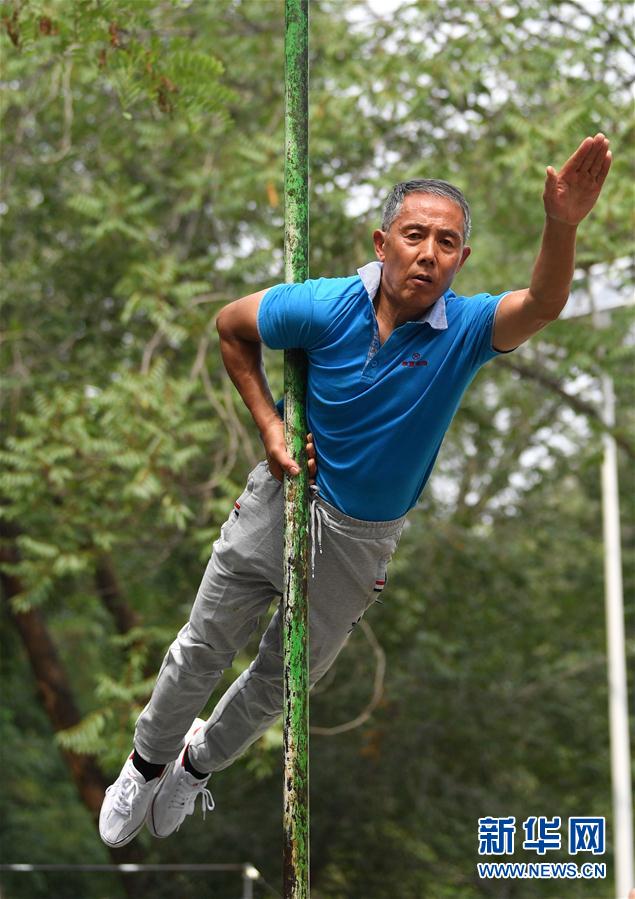 上杠、翻转、倒立.......在天津市红桥区西沽公园内的健身园,一群平均年龄68岁的老人正在练习各种体操和杂技动作,引得围观群众发出连连赞叹。 这支远近闻名的“老顽童”体操队现有固定成员20多人,年龄最大的81岁,最小的53岁。体操队成立10年来,他们坚持每天锻炼、每周表演。 队长佟玉根说:“我们不服老也不怕老,小时候都是‘孩子王’,老了也要强。健身锻炼让我们各个又强又壮,身体健康才能生活有质量。” 近年来,随着“老顽童”体操队的知名度不断提升,队伍也逐渐壮大。除了固定成员外,还有百余位健身爱好者经常一起参加锻炼。“老顽童”体操队的目标就是带动更多人参与到全民健身中来。 在天津市红桥区西沽公园,“老顽童”体操队队员、67岁的许崇起练习难度动作(8月4日摄)。 新华社记者 李然 摄