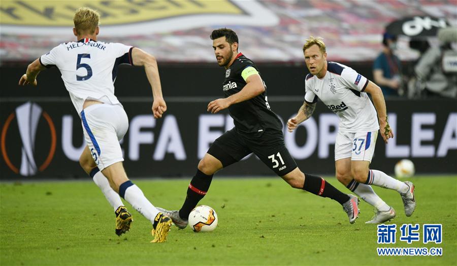 8月6日,勒沃库森队球员弗兰德(中)带球突破。 当日,在2019/2020赛季欧罗巴联赛八分之一决赛次回合比赛中,德国勒沃库森队主场以1比0战胜苏格兰格拉斯哥流浪者队,从而以4比1的总比分晋级八强。 新华社/路透