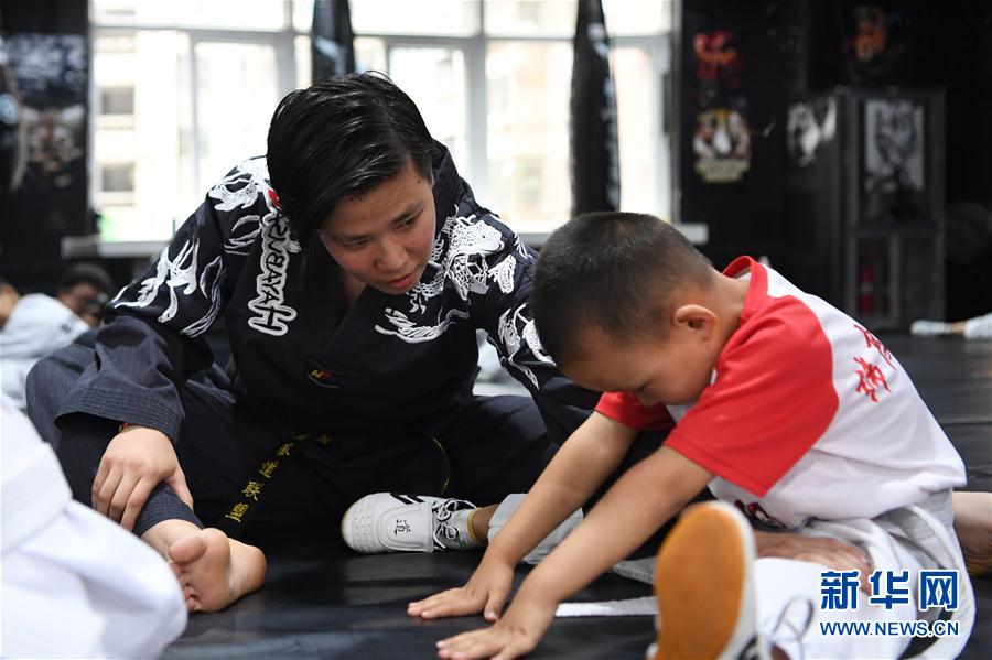 在甘肃省兰州市一家健身房内,薛金玉(左)指导一名小学员练习跆拳道(8月4日摄)。 两手护头,目视前方,快速出拳,绷紧的小腿在空中扫过一道弧线……搏击教练薛金玉在拳台上的动作要领示范,不时引来阵阵掌声。 今年24岁的薛金玉是甘肃兰州一家健身房的搏击教练。一次偶然的机会接触搏击运动后,她便彻底喜爱上了它,一练就是六年多。 2018年大学会计专业毕业后,薛金玉选择成为一名搏击运动员和教练。训练和比赛之外,薛金玉专心给学员进行搏击、跆拳道、散打等项目的指导,被大伙亲切地称为“搏击玫瑰”。 搏击运动因为比赛场面激烈,经常被贴上“暴力”的标签。“很多人认为女孩子就应该文文静静,但其实搏击是体力、智力、心理的综合较量。练习搏击不仅能自卫、防身,而且会使你内心更强大。我一直有个愿望,就是让更多女性接触和了解搏击。”薛金玉说。 在薛金玉的带动下,搏击成为她所在的健身房最受欢迎的运动之一。越来越多的年轻人走上拳台,享受搏击运动带来的快乐。 新华社记者陈斌摄