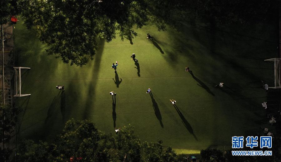 市民在宁夏银川市光明广场足球场内踢足球(无人机照片,7月26日摄)。 每当夜幕降临,宁夏银川市各大室外健身活动场所纷纷亮起灯光,如同繁星一般点亮整座城市,为市民提供充足的运动场地和多样的健身设施,让“健身族”在夜晚也可以挥洒汗水,享受运动之乐。据统计,银川市目前全市经常参加体育锻炼的群众达到99.33万人,公共体育场地设施(含学校)1600余个,人均体育场地面积2.88平方米。 新华社记者 王鹏 摄