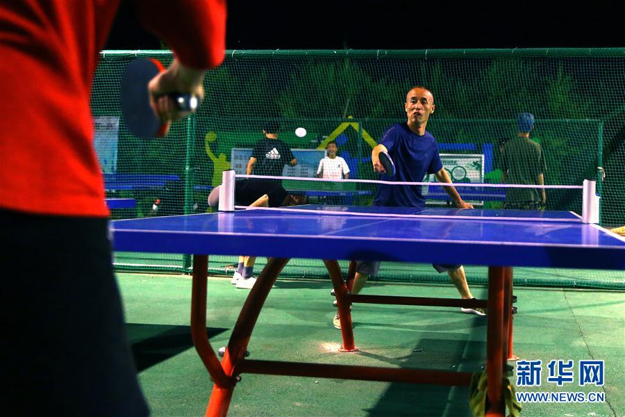 市民在宁夏银川市毓秀公园乒乓球场内打乒乓球(8月3日摄)。 每当夜幕降临,宁夏银川市各大室外健身活动场所纷纷亮起灯光,如同繁星一般点亮整座城市,为市民提供充足的运动场地和多样的健身设施,让“健身族”在夜晚也可以挥洒汗水,享受运动之乐。据统计,银川市目前全市经常参加体育锻炼的群众达到99.33万人,公共体育场地设施(含学校)1600余个,人均体育场地面积2.88平方米。 新华社记者 贾浩成 摄