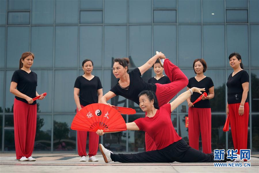 8月7日,在河北省沙河市,教练李玉在指导健身爱好者练习太极功夫扇。 在河北省沙河市文化艺术中心广场,众多健身爱好者清晨来此练习太极功夫扇,成为当地晨练一景。 新华社记者 牟宇 摄