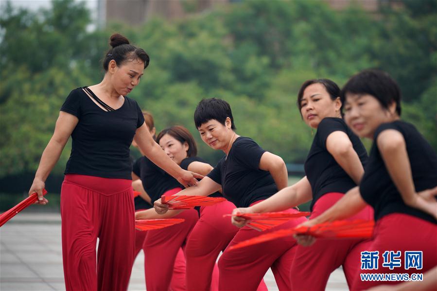 8月7日,在河北省沙河市,教练李玉(左一)在指导健身爱好者练习太极功夫扇。 在河北省沙河市文化艺术中心广场,众多健身爱好者清晨来此练习太极功夫扇,成为当地晨练一景。 新华社记者 牟宇 摄