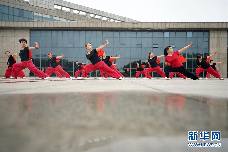 8月7日,在河北省沙河市,健身爱好者练习太极功夫扇。 在河北省沙河市文化艺术中心广场,众多健身爱好者清晨来此练习太极功夫扇,成为当地晨练一景。 新华社记者 牟宇 摄