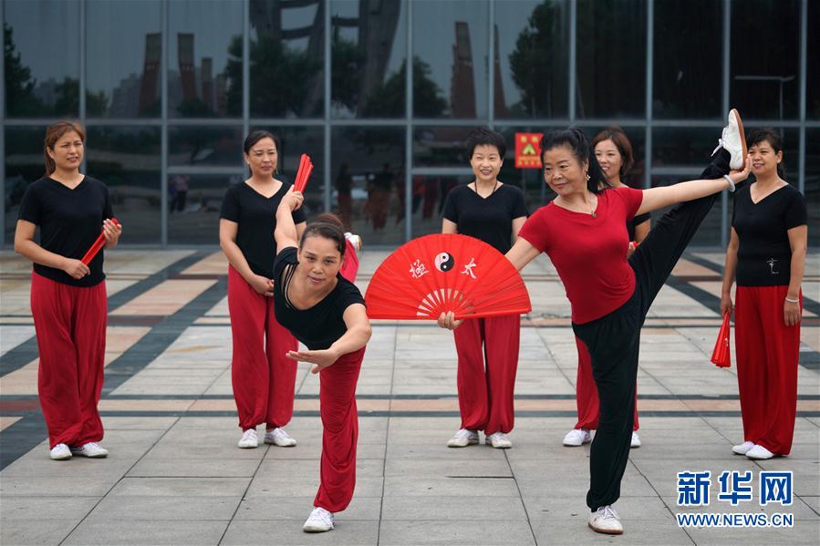 新华社照片,沙河(河北),2020年8月7日 (体育)(1)全民健身——河北沙河:晨练太极功夫扇 8月7日,在河北省沙河市,教练李玉(前左)在指导健身爱好者练习太极功夫扇。 在河北省沙河市文化艺术中心广场,众多健身爱好者清晨来此练习太极功夫扇,成为当地晨练一景。 新华社记者 牟宇 摄