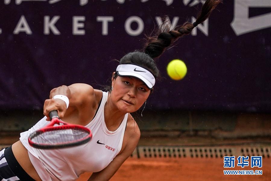 8月7日,曹思齐在比赛中发球。 当日,在2020中国网球巡回赛安宁站女单半决赛中,曹思齐以2比0战胜卢佳茜,晋级决赛。 新华社记者 胡超 摄