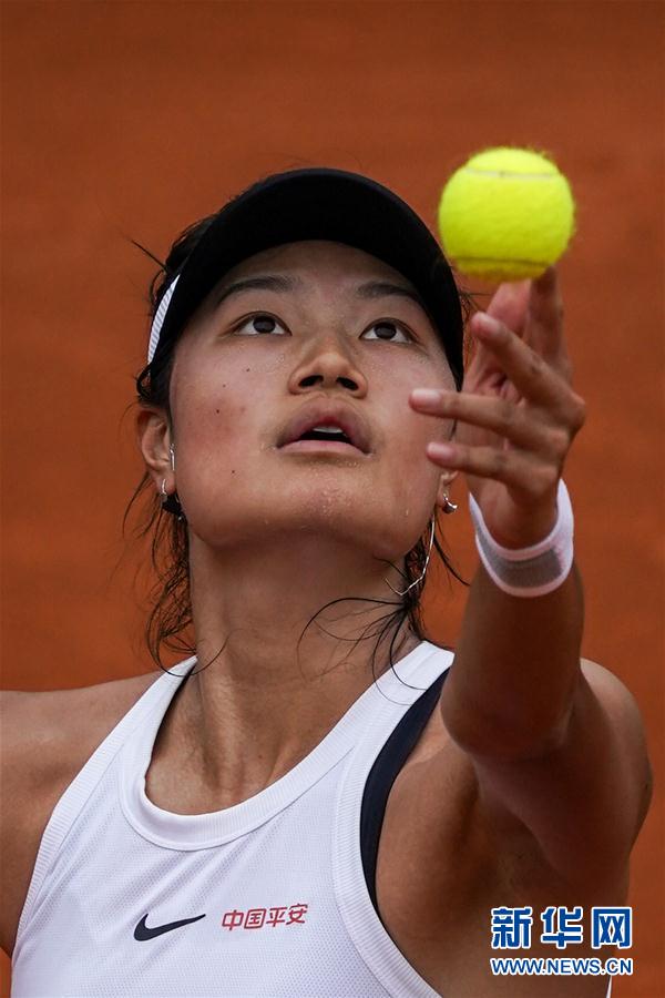 8月7日,曹思齐在比赛中发球。 当日,在2020中国网球巡回赛安宁站女单半决赛中,曹思齐以2比0战胜卢佳茜,晋级决赛。 新华社记者 胡超 摄