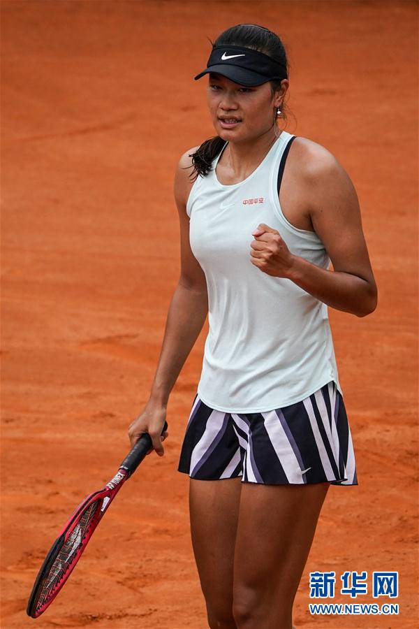 8月7日,曹思齐庆祝得分。 当日,在2020中国网球巡回赛安宁站女单半决赛中,曹思齐以2比0战胜卢佳茜,晋级决赛。 新华社记者 胡超 摄