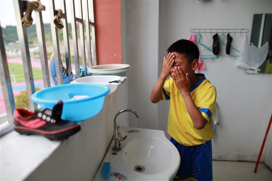 “青椒足球队”的一名队员在宿舍里洗脸(8月7日摄)。新华社记者刘续摄