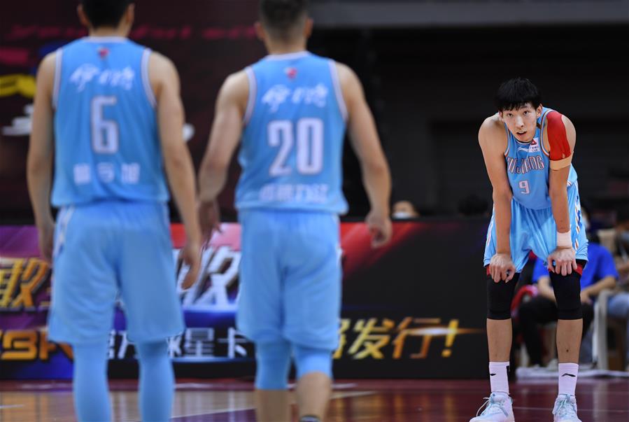 8月7日,新疆伊力特队球员周琦(右一)在比赛中。 当日,在山东青岛举行的2019-2020赛季中国男子篮球职业联赛(CBA)季后赛半决赛第二轮比赛中,新疆伊力特队以113比119不敌辽宁本钢队,以总比分0比2遭淘汰,无缘决赛。 新华社记者 李紫恒 摄
