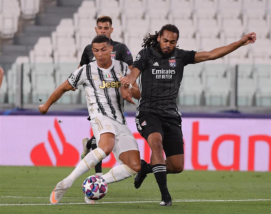 8月7日,尤文图斯队球员克·罗纳尔多(左)与里昂队球员德纳耶在比赛中拼抢。 当日,在2019-2020赛季欧洲足球冠军联赛八分之一决赛第二回合比赛中,意甲尤文图斯队主场以2比1战胜法甲里昂队,双方总比分战成2比2。最终,尤文图斯队因客场进球劣势无缘八强。 新华社发(费德里科·塔尔迪托摄)