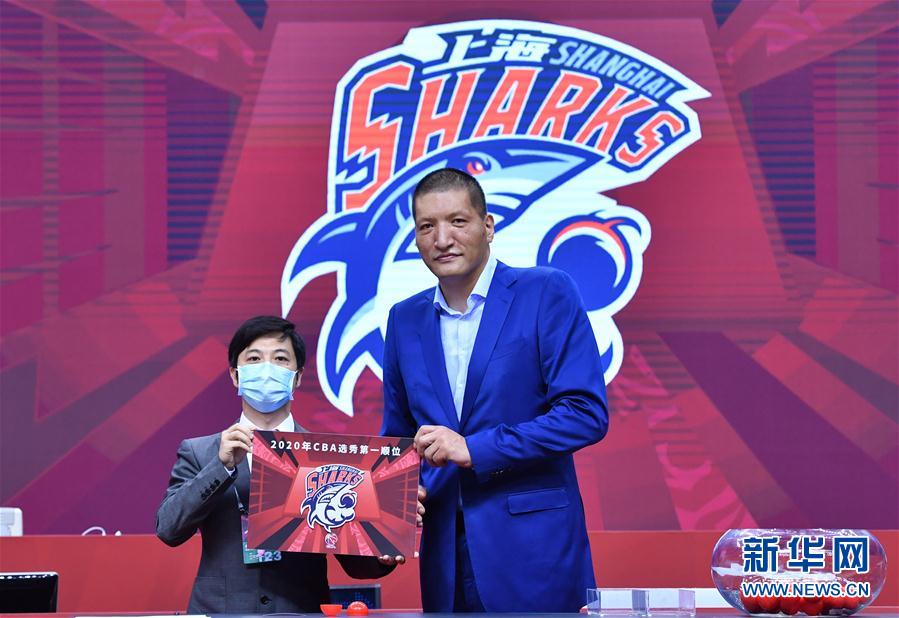 8月10日,抽签嘉宾巴特尔(右)和获得第一顺位的上海久事队代表在抽签仪式上。 当日,2020年CBA选秀乐透抽签仪式在山东青岛举行。上海久事队获得第一顺位选秀权,时代中国广州队和天津先行者队分别获得第二和第三顺位。 新华社记者朱峥摄